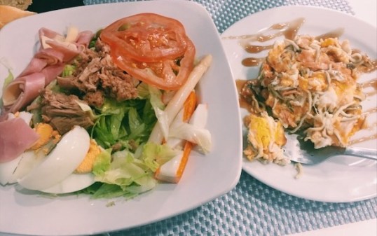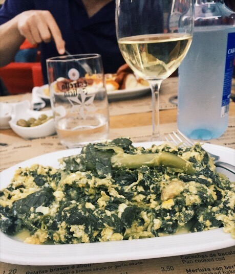 LOVED this meal. On the left is a salad, and on the right is scrambled eggs with squid and salmon (scrambled eggs are called “revueltos”). Was deliciousss.