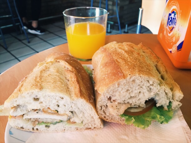 Here is a chicken sandwich that I got from a local, family owned shop, a “bocateria.” I’ve been coming to this place really often. It’s fast, good simple food, and cheap. Only like 2-3 euros per sandwich. The orange juice pictured is also freshly squeezed 🙂